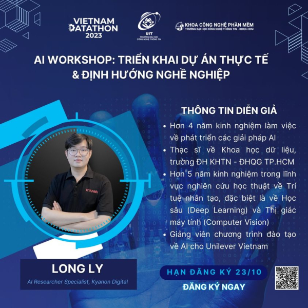 Join us, students, in the upcoming "AI Workshop: Real Project Deployment and Career Orientation" on October 25th. The Vietnam Datathon organizing committee is delighted to introduce Mr. Lý Phi Long from the Data AI team at Kyanon Digital. He will share insights into the development and implementation process of an AI project, discussing roles, positions, teamwork dynamics, and career prospects in the field of AI for students.