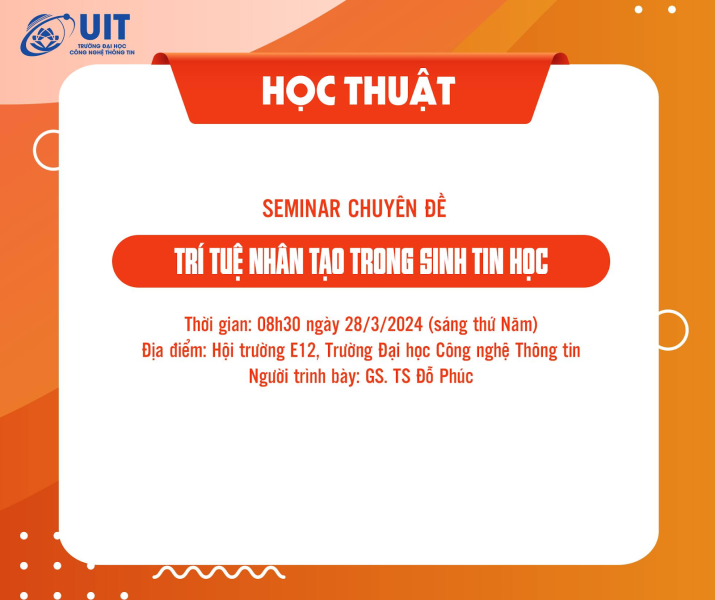 After the health and mental care activities, as well as skill development programs, UITers will be equipped with academic knowledge through the specialized seminar "ARTIFICIAL INTELLIGENCE IN BIOINFORMATICS" held at 8:30 am on March 28, 2024, at Hall E (12th floor, E building, University of Information Technology) with the guest speaker being Professor TS. Do Phuc.
