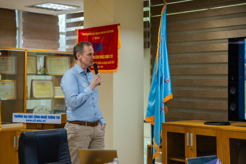Opening the session, Assoc. Prof. Dr. Le Dinh Duy introduced the university’s key achievements in training and research, as well as UIT’s core strengths in ICT and Artificial Intelligence (AI). He also shared UIT’s orientation in strengthening cooperation with enterprises to promote innovation and practical engagement.
